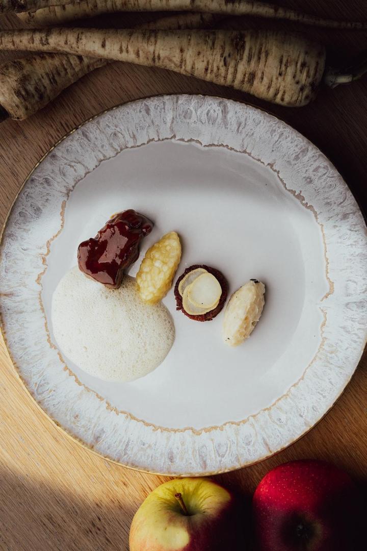 Een 4-gangendiner met bijpassende wijnen, bruisend aperitief en waterservice.